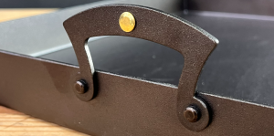 - Cut and bent from a 2 mm black iron sheet with hand-welded corners.