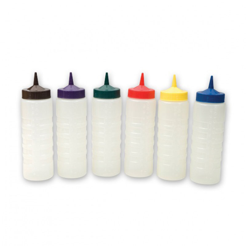 These Cater-Rax sauce bottles have wide mouths for easy filling, and are graduated for easy measuring. The colour-coded lids allow you to easily locate and designate which each bottle contains quickly in a busy hospitality environment.