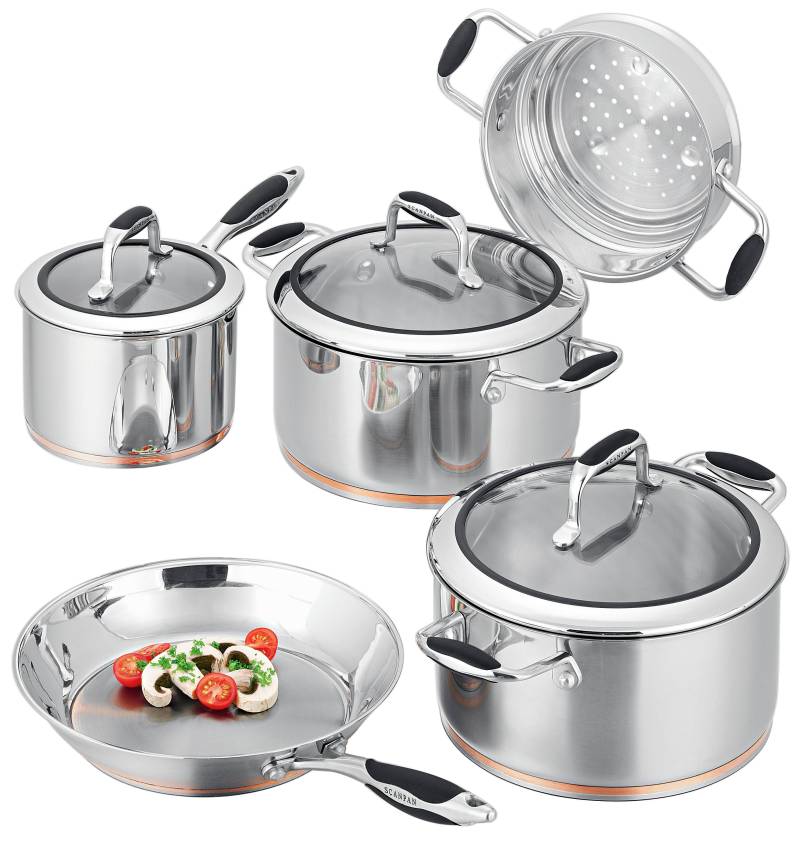 This SCANPAN Coppernox 5 piece set expands on traditional cookware with its unique construction.