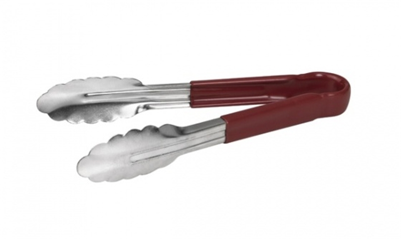 Heavy-duty stainless steel tongs crafted specifically for commercial applications, boasting a brown coloured PVC-coated handle for enhanced grip and comfort.