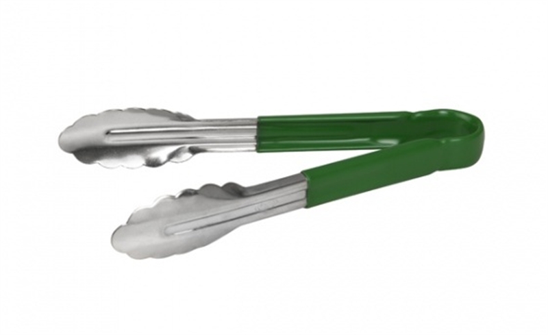 Durable stainless steel tongs tailored for commercial use, featuring a green PVC-coated handle for superior grip and comfort.