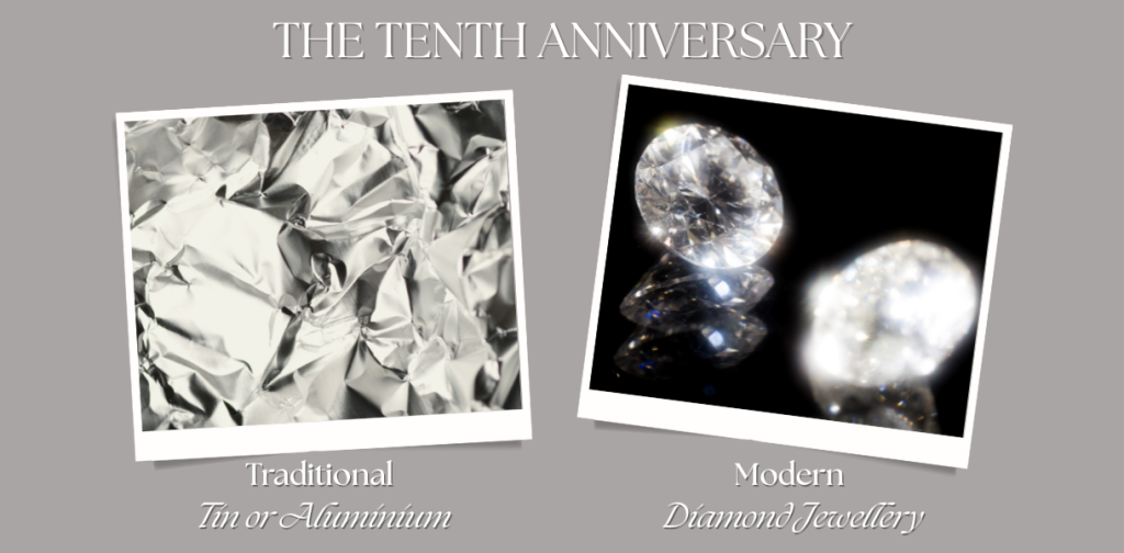 Ten years of marriage is a major milestone, a full decade of love, growth, and shared life. Tin and aluminium, the traditional symbols, represent flexibility and durability. They reflect a relationship that bends without breaking, weathering life’s ups and downs with resilience. The modern symbol, diamond jewellery, brings in strength and brilliance… a lasting bond that shines brighter with time.