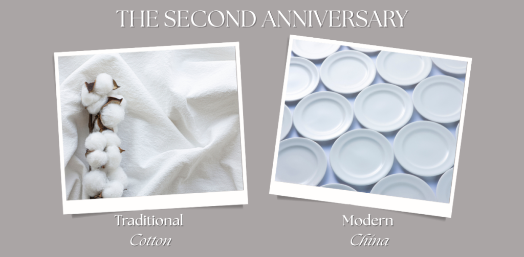 The second anniversary celebrates a relationship that’s becoming stronger and more intertwined. Cotton, the traditional symbol, is associated with comfort, flexibility, and how two lives are now woven together. The modern symbol, china, represents delicate beauty and the care it takes to keep a relationship thriving.