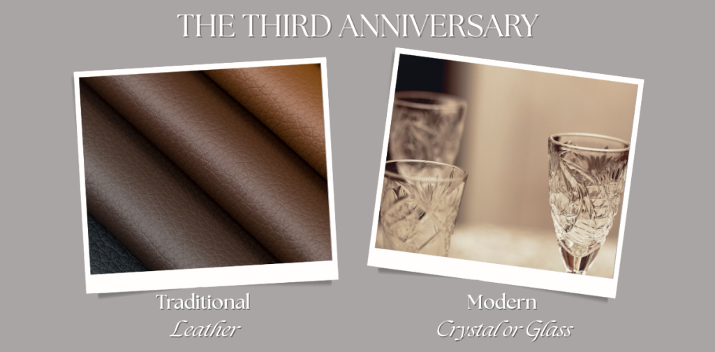 The third anniversary celebrates strength, resilience, and growing intimacy. Leather represents protection and durability, like a relationship that has softened and deepened with time. Crystal and glass, the modern symbols, reflect clarity and care, reminding us that love, while strong, also needs to be nurtured and handled with intention.