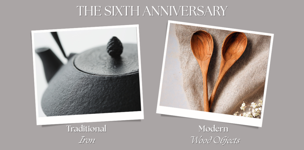 Six years of marriage are marked by strength, resilience, and quiet endurance. Iron, the traditional symbol, represents a relationship forged through time, solid, steady, and built to last. Wood objects, the modern symbol, reflect natural beauty and stability. It speaks to a love that’s grounded and enduring, yet still growing, rooted in trust and shaped by shared experiences.