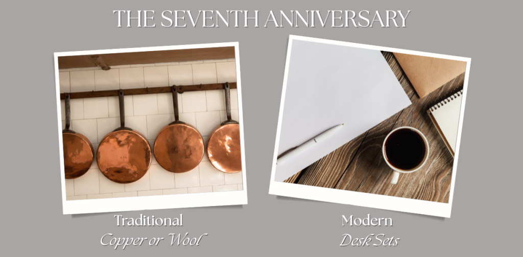 The seventh anniversary marks warmth, stability, and growing connection. Wool symbolises comfort and protection, a love that wraps around you like a favourite blanket. Copper brings in energy and balance, reflecting the strength and harmony of a well-matched partnership. The modern symbol, desk sets, represents the practical side of love: shared goals, daily routines, and building a life together.