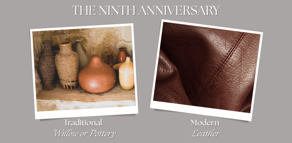 Nine years of marriage celebrate a relationship shaped with care and strengthened by time. Pottery or willow, the traditional gifts, represent both strength and vulnerability, moulded by hand and hardened through fire, much like a lasting partnership. Leather, the modern symbol, adds a sense of resilience and flexibility, reflecting a bond that has weathered life’s seasons and grown softer, yet stronger, with experience.