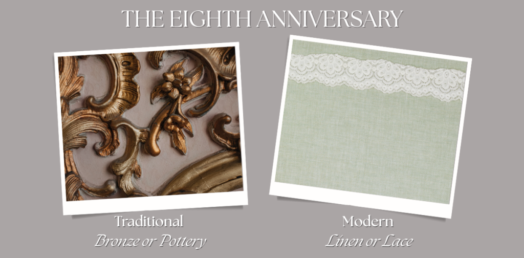 Eight years of marriage mark a union strengthened through time and shared experience. Bronze, a blend of copper and tin, symbolises resilience, collaboration, and the beauty of two lives forged together. Linen and lace, the modern symbols, reflect grace, intricacy, and the gentle strength found in a life carefully woven over time. Together, they speak to a love that’s both enduring and elegant, strong at its core, and softened by care.