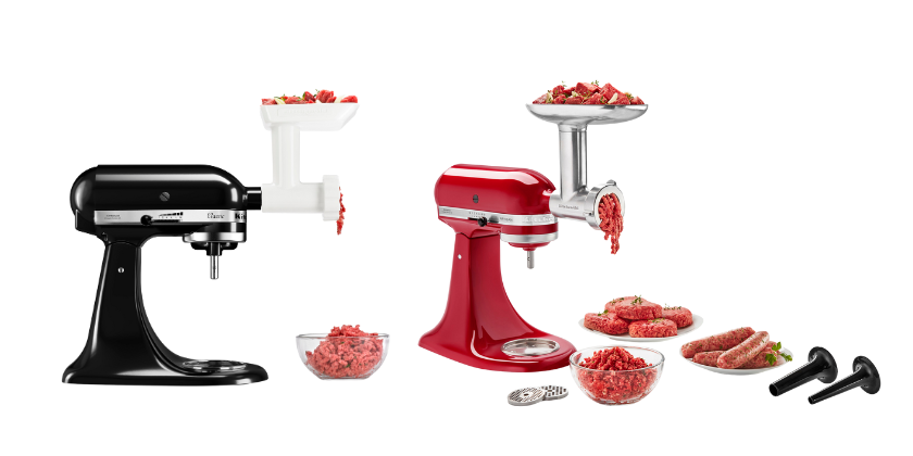 The KitchenAid Food Mincer & Grinder Attachment and the heavy-duty Metal Food Mincer & Grinder Attachment (complete with sausage stuffer) transform your stand mixer into a craft-style food maker. Picture shaping gourmet burgers from free-range beef, freshly grinding parmesan over salads, or experimenting with cold-pressed vegetable “meat” for plant-based dishes – all while entertaining, with your mixer quietly doing the work in the background.