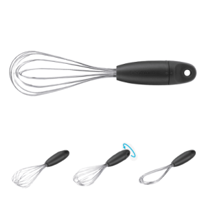 Meet the 3-in-1 whisk that folds flat for easy storage! The Flisk transforms from a balloon whisk to a sauce whisk to a flat scraper whisk in just a twist. Its clever design means fewer utensils cluttering your drawers. The Mini Flisk offers all the same functionality in a pint-sized package, perfect for dressings, sauces, and kids’ cooking projects.