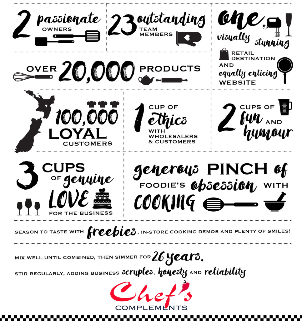 Chef’s Complements is armed with kitchen supplies and implements for every kitchen task imaginable, suitable for gadget-lovers or as a gift for the hard-to-buy-for chef. This leading kitchenware store in Taupo has its own imported commercial kitchenware ranges. If your business includes food preparation or beverage service, then Chef’s Complements is there to help. From cutlery, tableware, buffetware, bar and counter service to kitchenware and cookware, all kitchen supplies are available to the industry at trade prices. Chef’s Complements kitchen shop caters to the needs of restaurants, cafés, bakeries, takeaways, maraes, schools, retirement homes and sporting and training institutions.