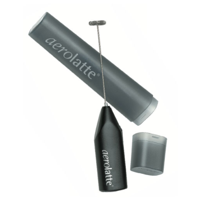 Take a high-sided mug and fill to a third of its height with hot milk (not boiling – just hot). The aerolatte® frother will whisk the milk to three or four times the original volume. Take the aerolatte® frother and place it in the glass almost to the bottom. Hold the aerolatte® at a slight angle. Turn it on. In a few seconds you will see creamy foam begin to form. Raise the aerolatte® frother slowly to the top of the glass – but don’t take it out – lower it again. Do this a few times and you’ll see the milk froth right to the top. Once the foam is thick, you can create great peaks of foam by moving the aerolatte® whisk head slowly around the top of the froth (just under the surface).