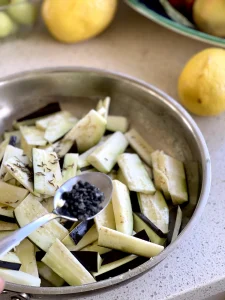 - Once your onions have almost caramelised (they look a deep purpley-brown), add in the sliced aubergine strips, 2 teaspoons cumin seeds and 1 ½ teaspoons of Opito Bay Black Garlic Sea Salt. Stir and cook until the aubergines have turned a dark brown colour, as shown in the pictures. Taste and add more Opito Bay Black Garlic Sea Salt as you like.