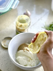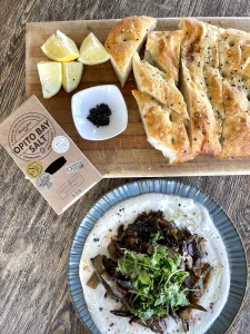 - If you have cut up the aubergine and you are still waiting for your onions to caramelise, then mix 1 cup of Greek yoghurt, one teaspoon of hulled tahini and the juice of one lemon. Add a pinch of any white salt (but of course, my preference would be for you to use the Original Natural Opito Bay Sea Salt) and stir well. Taste the tahini yoghurt base and add more salt as you desire (some yoghurts are saltier than others).