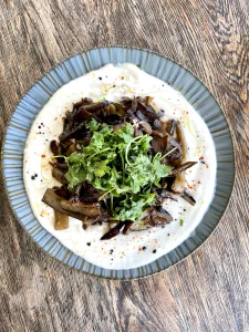 - To plate up, on a beautiful serving plate of your choice, dollop all the tahini yoghurt you made earlier and spread it across the plate. Pile up the caramelised black garlic aubergine and onion mixture in the centre. Pile up the torn coriander on top. Grab a pinch of chilli powder and sprinkle it across the yoghurt and aubergines. Do the same with the Opito Bay Black Garlic Sea Salt and sprinkle over the yoghurt for a beautiful black and white contrast.